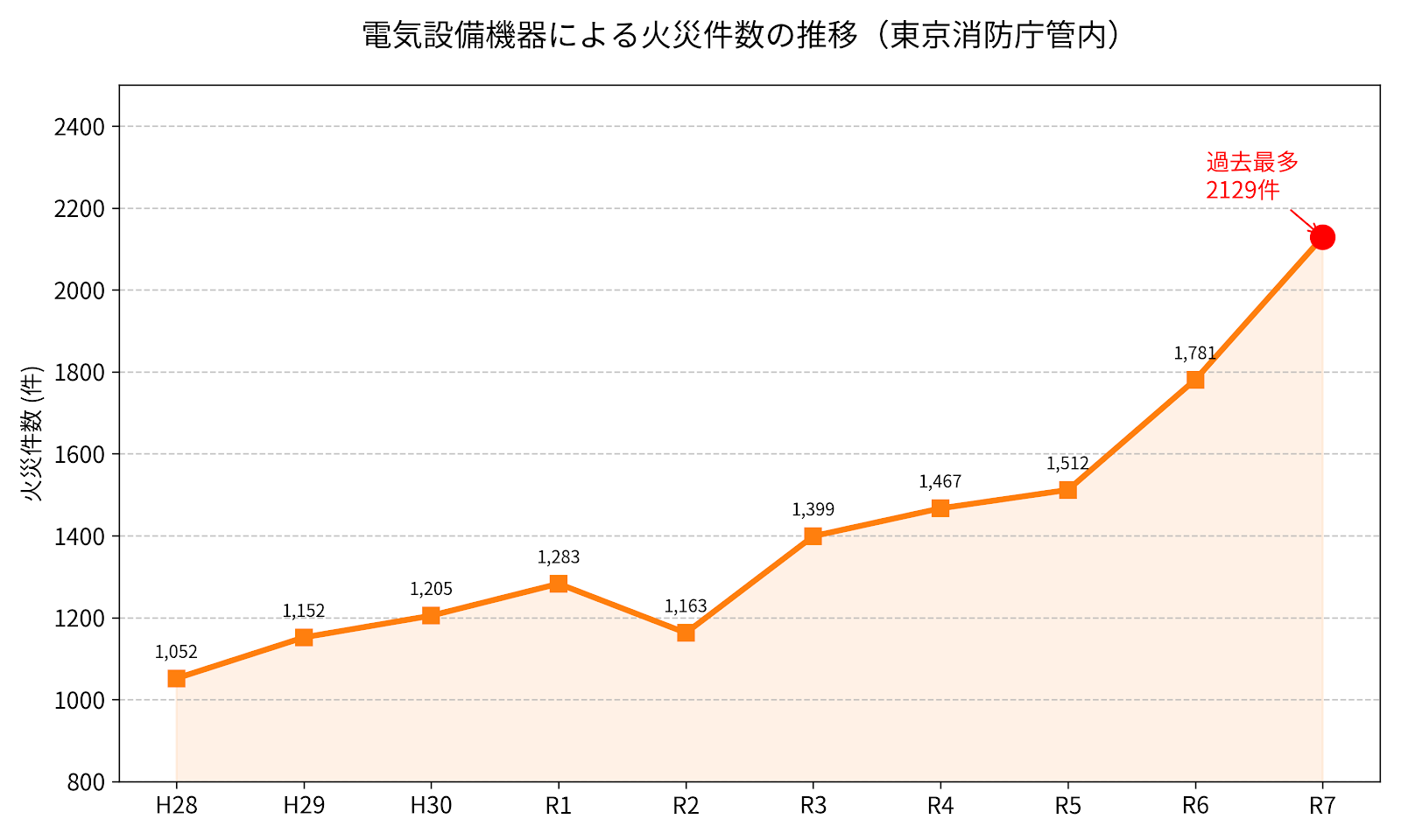 東京消防庁全体で見ると、電気設備機器を原因とする火災は過去最多の2,129件を記録しました。