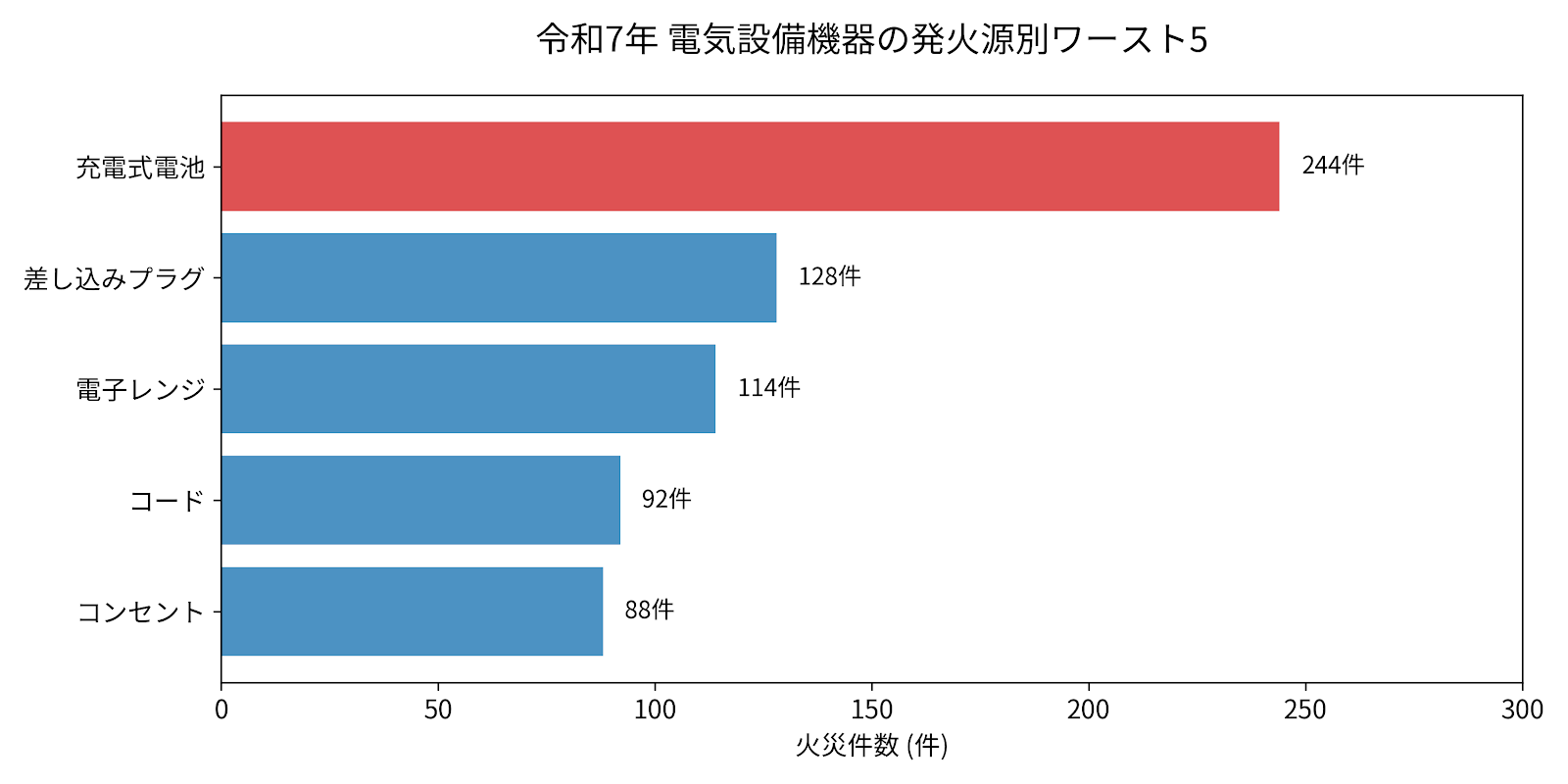 出火原因のワースト5を見ると、これまで同様の「たばこ」や「ガステーブル」に並び、「充電式電池(モバイルバッテリー等)」による火災が目立っています。