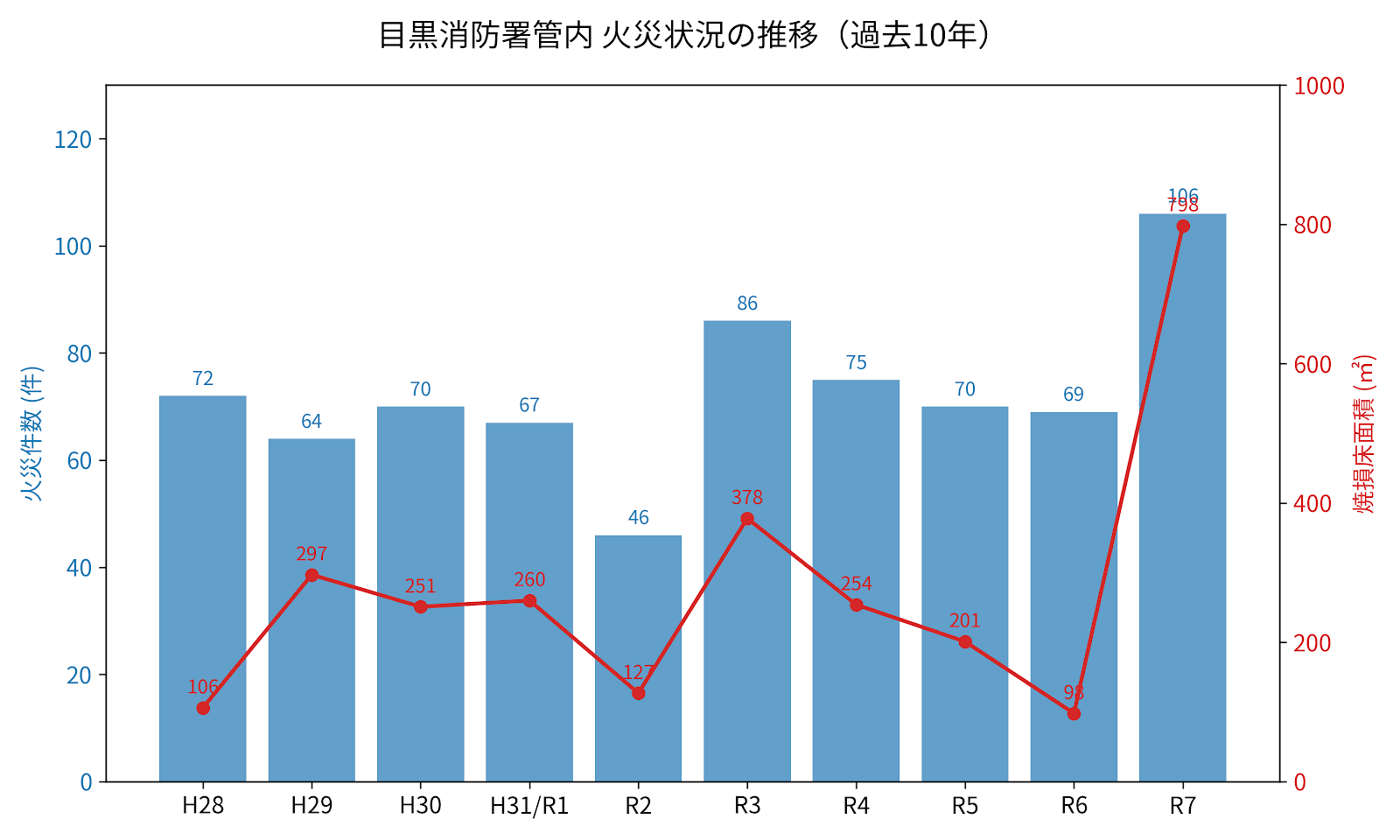 令和7年中の目黒消防署管内での火災件数は106件に達し、前年より37件も増加しました。年間100件を超えたのは約20年ぶりであり、非常に憂慮すべき事態です。